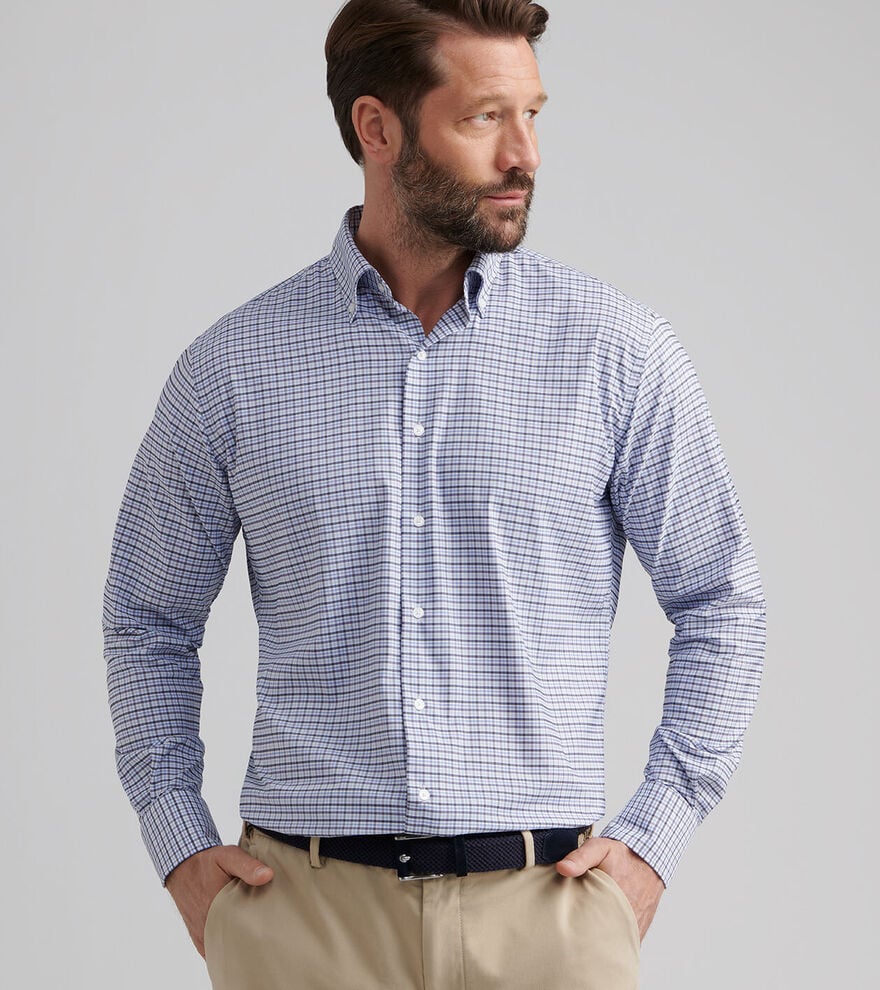 A new season brings a sharper focus on sport shirts. Our performance twill sport shirts have been updated with a slightly new collar expression and more refined detailing for an effortlessly versatile look. A signature performance fabric provides stretch, moisture-wicking and easy-care properties. Finished with a French placket, faux mother-of-pearl buttons and a soft barrel cuff.