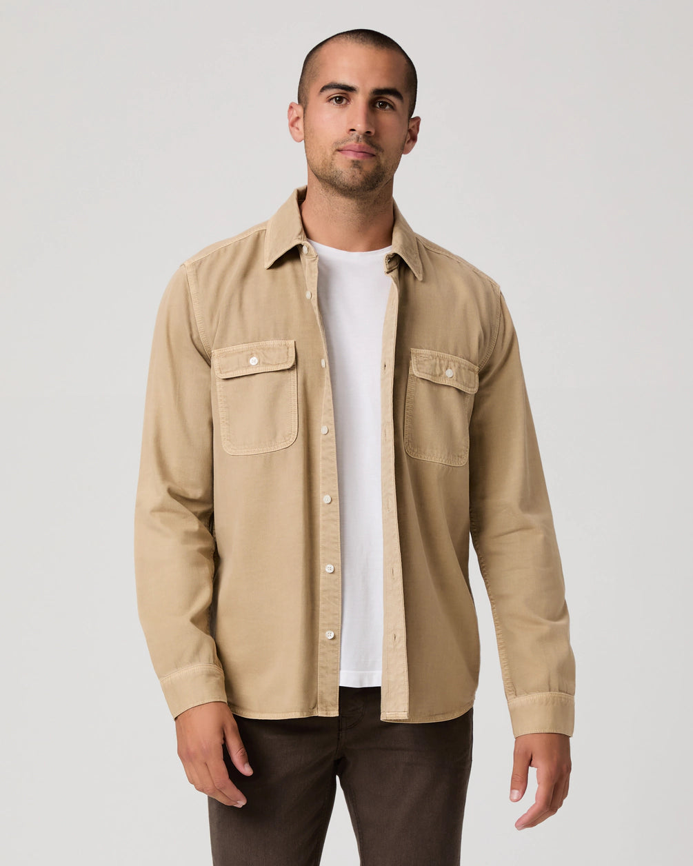This long sleeve button up is a year-round menswear must-have. Made from a lightweight, incredibly soft sueded twill fabric in a vintage-inspired muted beige hue, the Martin Shirt is designed with a regular fit, double chest pocket with a button detail and contrast stitching for a utilitarian feel.