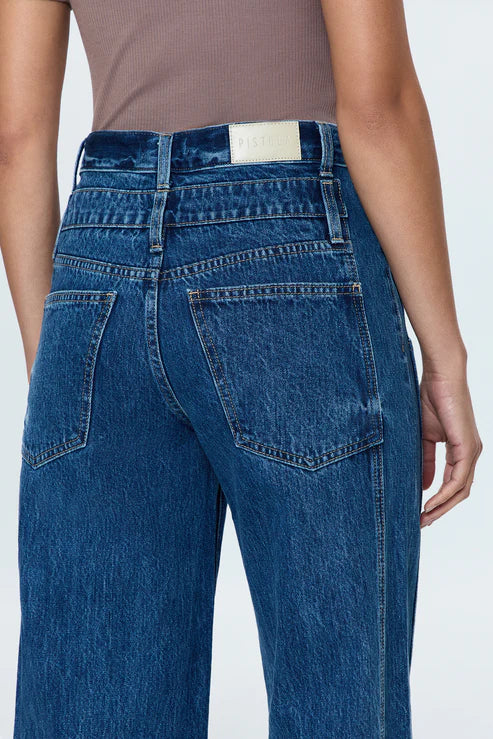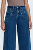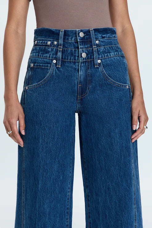 High rise denim with a relaxed, wide leg silhouette and full length hem. Defined by a double stacked waistband and elevated side seam details.