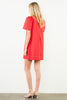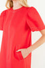 Bold, classic, and effortlessly chic, this vibrant red shift dress is a standout for any occasion. Designed with subtle puff sleeves for a feminine touch, it features crisp contrast stitching that adds structure and modern detail. The relaxed silhouette offers easy wear, while the front patch pocket brings a hint of casual charm. Finished with a clean crew neckline and above-the-knee length, this dress is perfect for everything from daytime events to dinner out—just add your favorite sandals or heels and go.