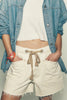 Features: Pull-on design, drawcord waist detail, oversized pouch pockets, raw-edge hem