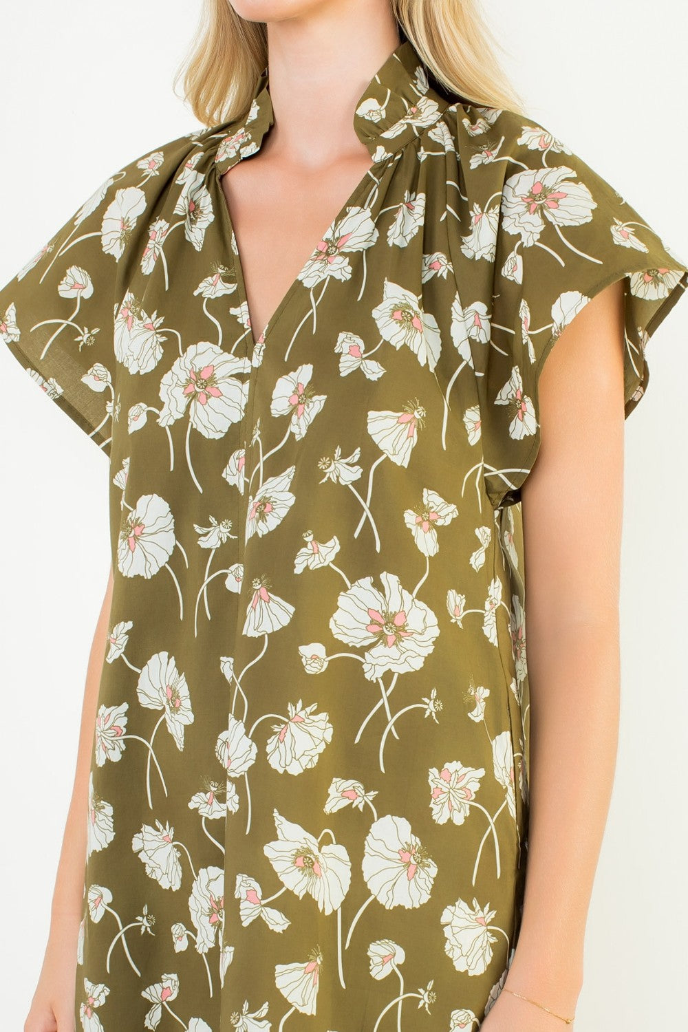 This olive-green floral dress blends effortless charm with everyday polish. Featuring a soft poppy print in ivory and blush tones, it’s designed with a split neckline, gentle gathers at the collar, and relaxed short sleeves for an airy silhouette. Lightweight and easy to style, it transitions perfectly from weekday lunch to weekend outings with sandals or boots.