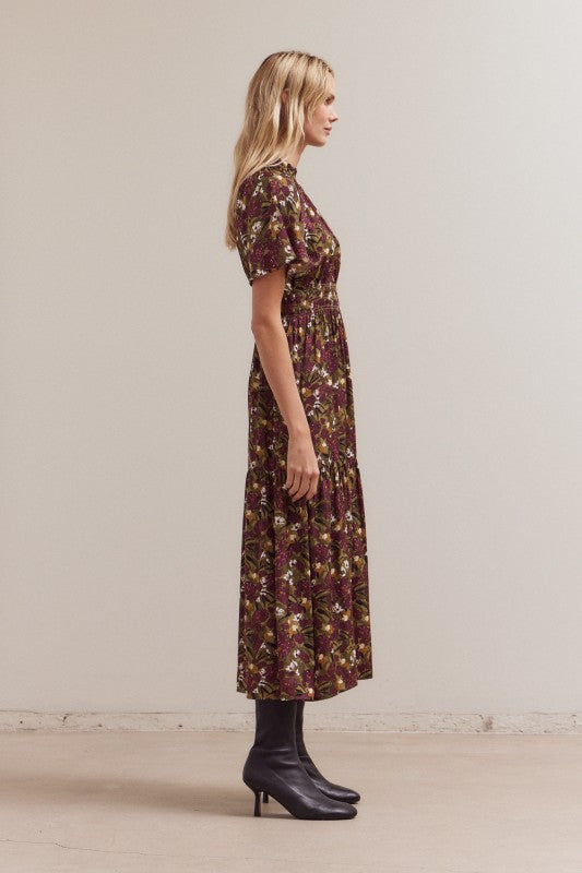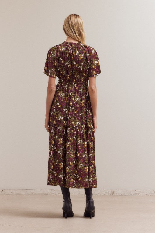 Romantic, floaty, and fall-ready. Our Raglan Sleeve Tier Maxi Dress features soft raglan sleeves with a fluttery drape, a gently ruffled mock neckline with tie detail, and a smocked/elastic waist that defines without feeling tight. The tiered skirt moves beautifully with every step, while the rich floral print in berry, olive, and cream brings instant polish.