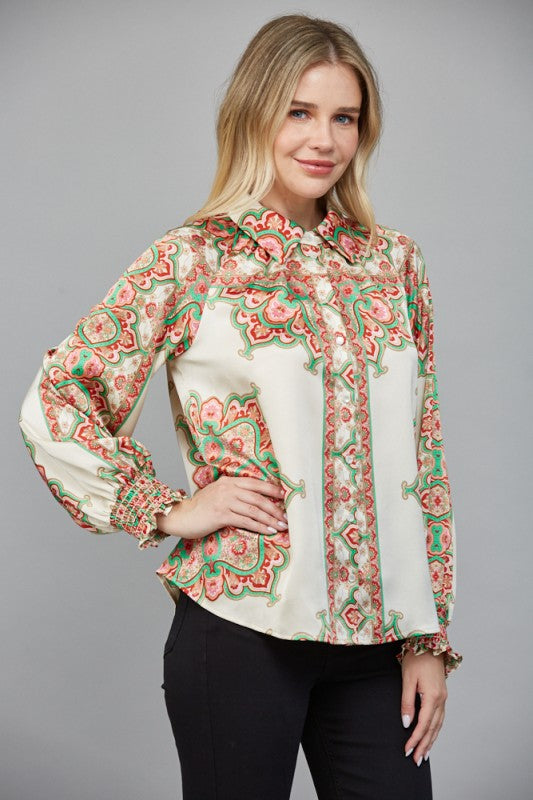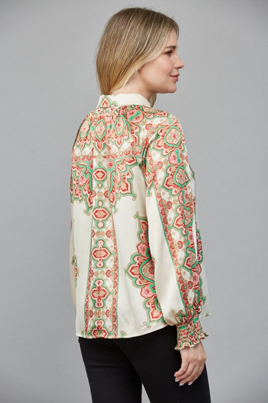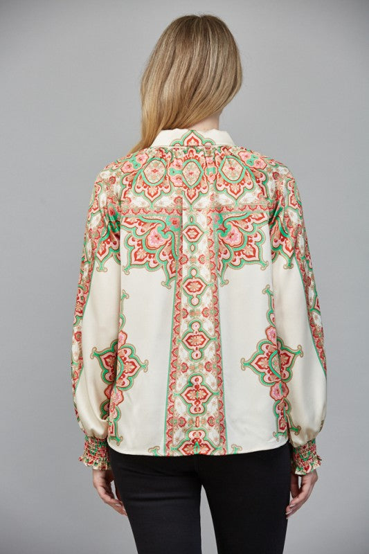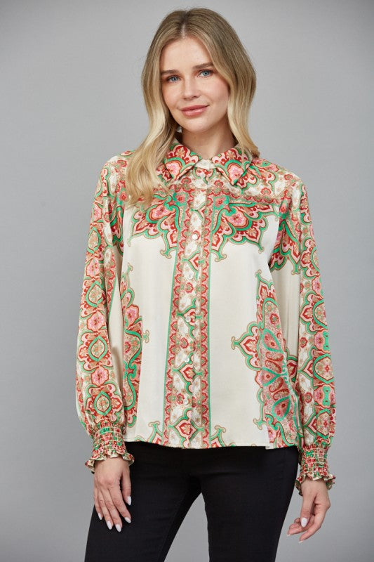 A statement blouse that brings color, artistry, and effortless elegance to any outfit. The Holiday Tapestry Top features a beautifully placed abstract border print in rich shades of coral, green, and cream, giving it a luxe, global-inspired feel. The silky drape adds movement, while the button-down front and tailored collar keep it polished. Long sleeves with smocked cuffs add a feminine finishing touch.