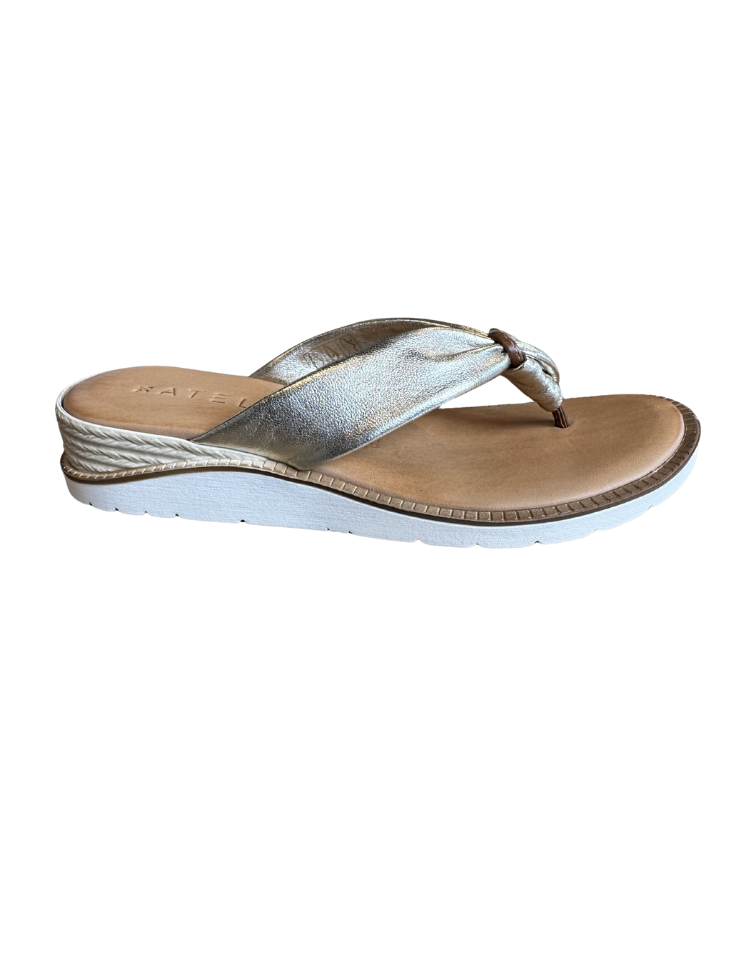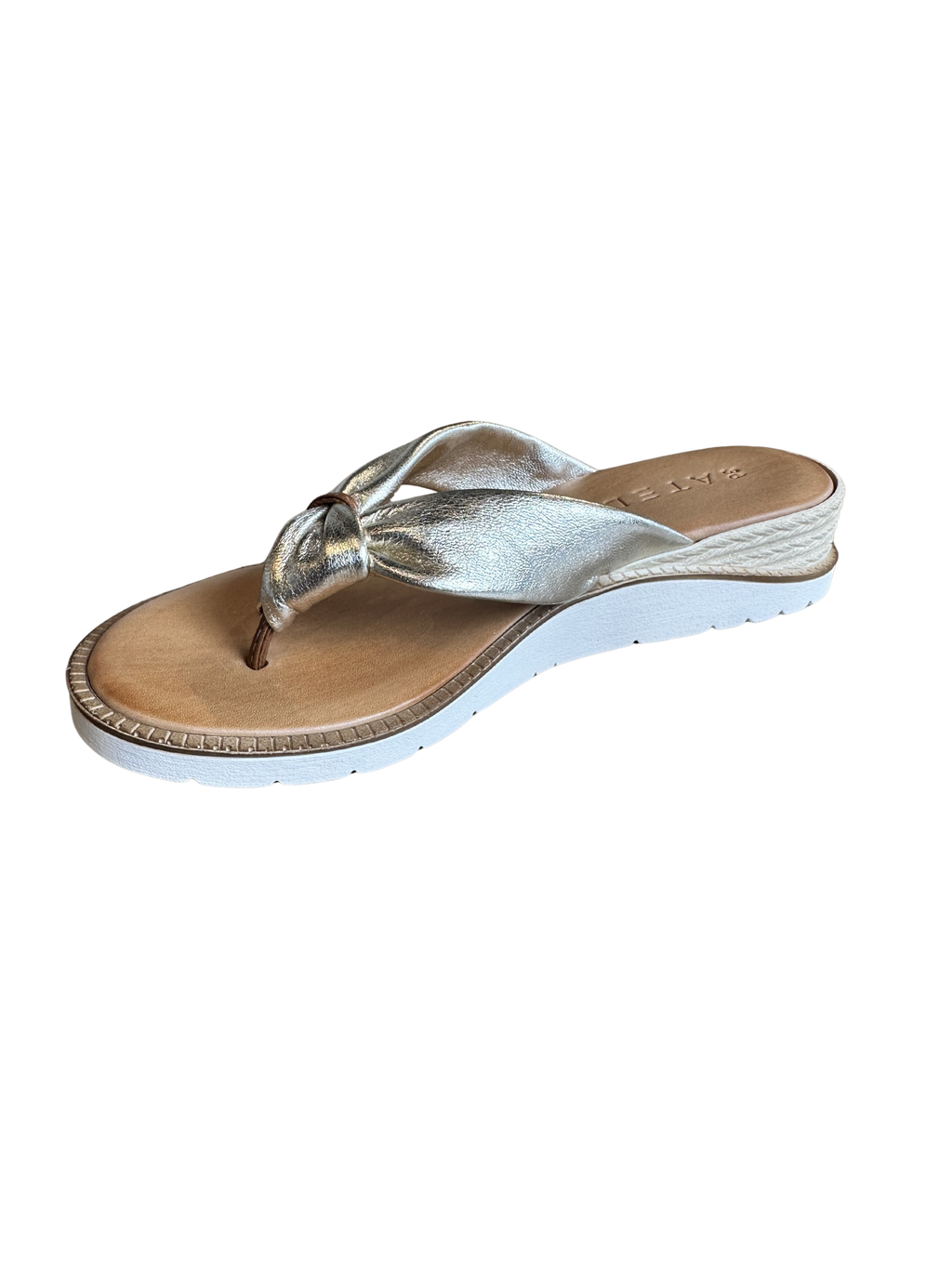 Elevated and effortless, the Chandra sandal by Ateliers brings a refined touch to everyday styling. Crafted in soft metallic gold leather, this thong-style slide features a twisted strap detail that adds subtle texture and dimension.
