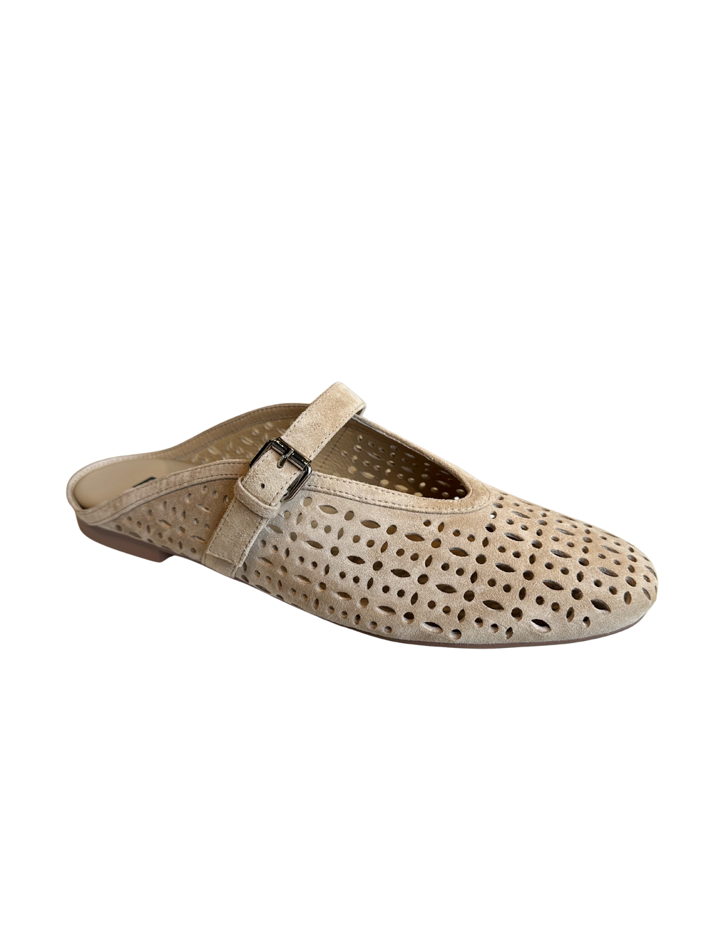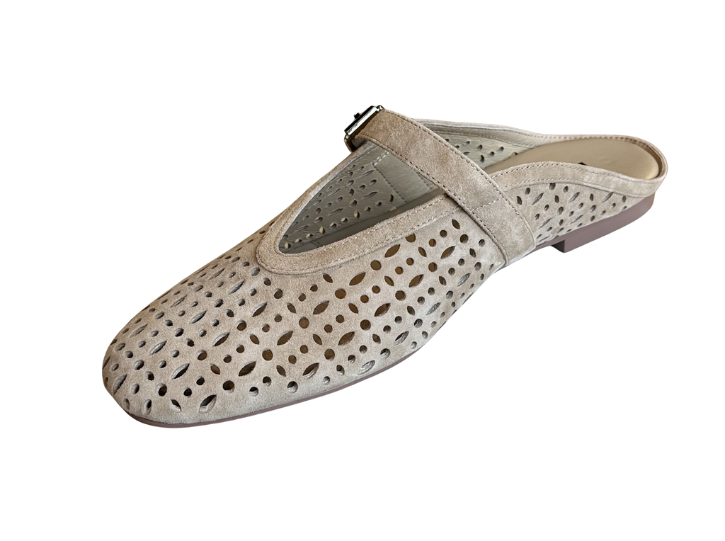 A fresh take on a classic flat, this suede loafer blends effortless style with everyday comfort. Crafted in soft, supple suede, it features intricate perforated detailing that keeps the look light and breathable while adding subtle texture. The modern Mary Jane strap with an adjustable buckle offers a secure fit and a feminine touch, while the sleek, pointed silhouette gives it a polished finish. Comfortable, versatile, and just a little unexpected, this loafer is the kind of piece that instantly elevates your everyday look.
