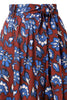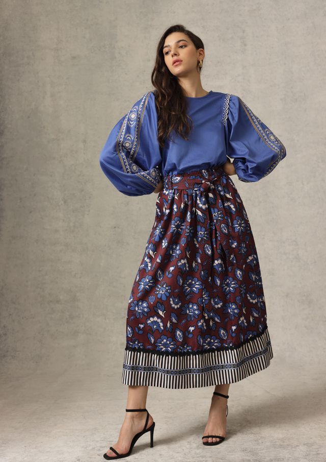 The Maya Skirt blends bold artistry with timeless femininity. Featuring a rich maroon base adorned with cobalt and ivory florals, it’s finished with a striking striped border that adds modern contrast and movement. The high, belted waist flatters every figure while the full, midi-length silhouette drapes gracefully for an effortlessly polished look. Pair it with a simple blouse or crisp button-down to let the print shine — a statement piece that’s equal parts elegant and versatile.