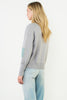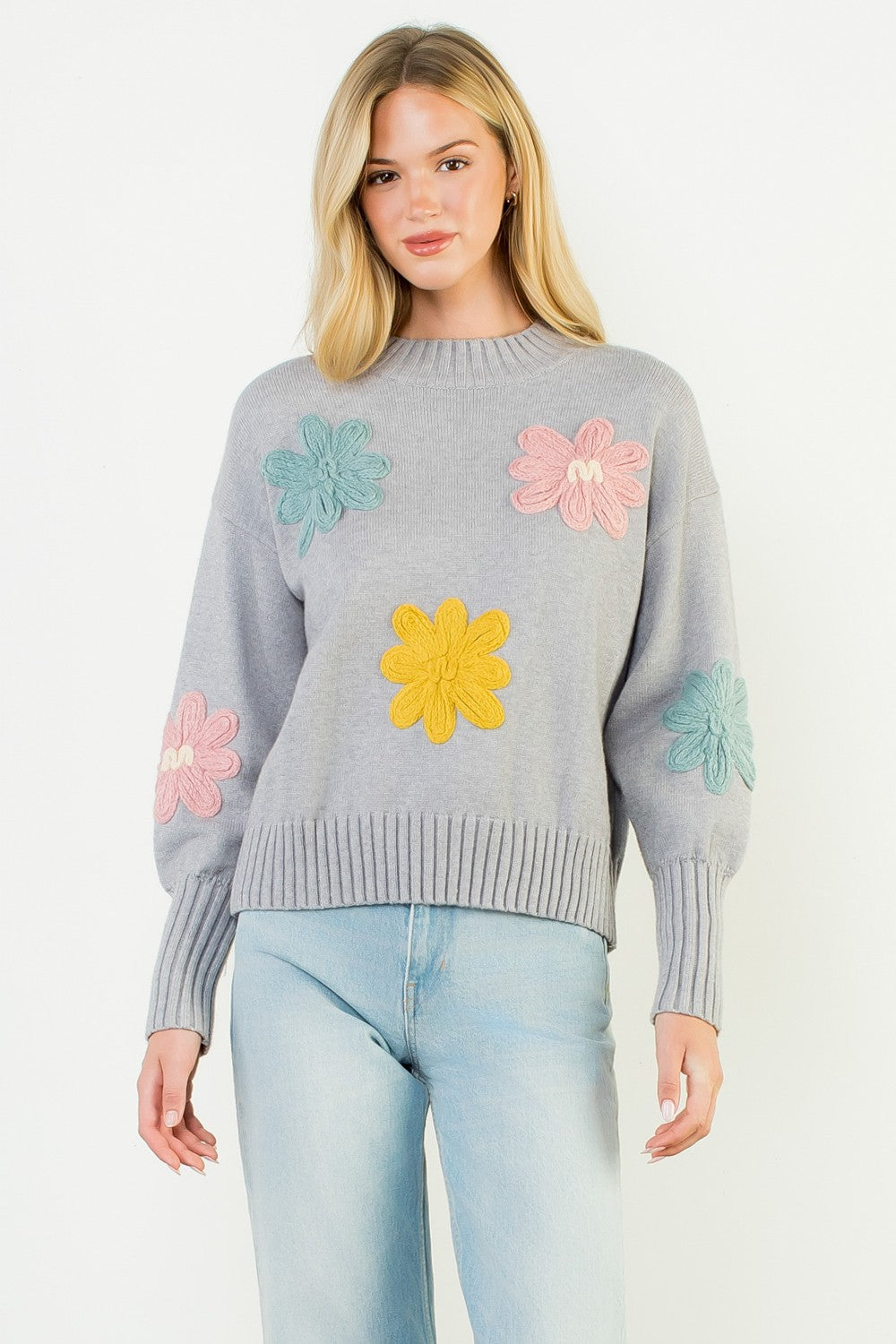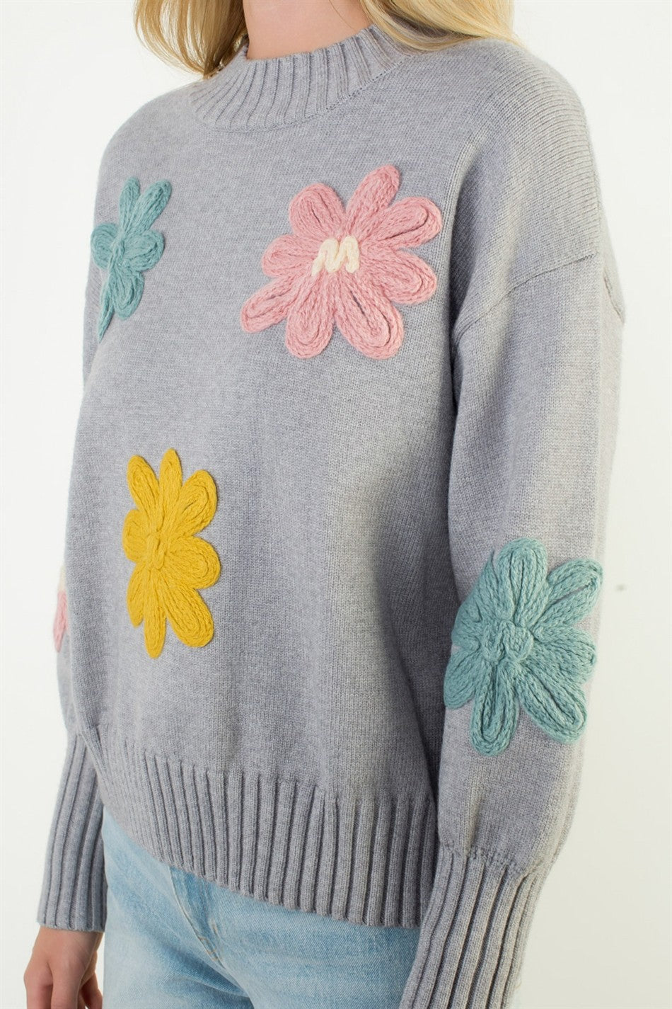 Soft heather-gray knit sweater with playful oversized floral appliqués in pastel pink, mustard yellow, and aqua blue. Features a relaxed fit, ribbed neckline and cuffs, and cozy mid-weight feel. A cheerful, feminine piece that pairs perfectly with denim for an easy fall-to-spring look.