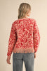 This statement cardigan brings artful elegance to cozy layering. Knit from a soft, mid-weight yarn, it features an abstract floral jacquard pattern in shades of blush and crimson. The round neckline and button-front placket are edged in ribbing, with delicate pearl-like buttons adding a polished touch. Long sleeves finish in snug, ribbed cuffs to hold their shape, while the waist-skimming hem is trimmed with playful fringe for bohemian flair. Wear it open over a tee or buttoned as a top—either way, its rich texture and unique details elevate any casual look.