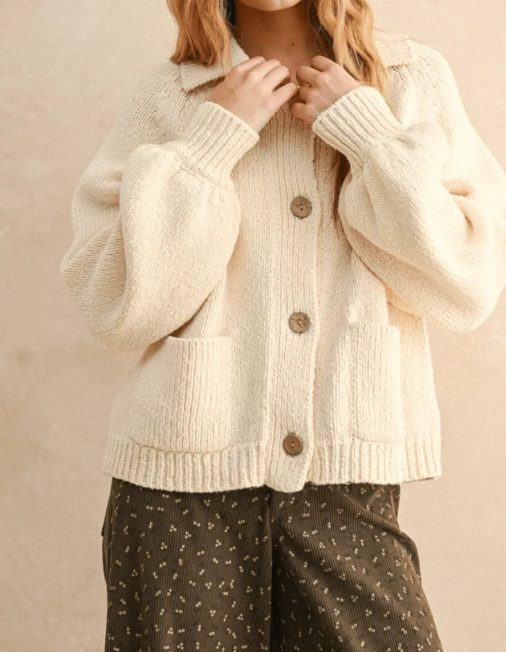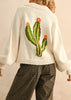 Step into effortless desert chic with this playful yet cozy sweater cardigan. Crafted from a creamy, chunky knit that feels soft and warm, its relaxed, slouchy silhouette features drop shoulders for a laid-back vibe. The button-front closure is finished with natural wood-inspired buttons, while two front patch pockets add casual charm. On the back, a vibrant cactus intarsia design blooms with orange flowers—bringing a pop of personality to cooler days.