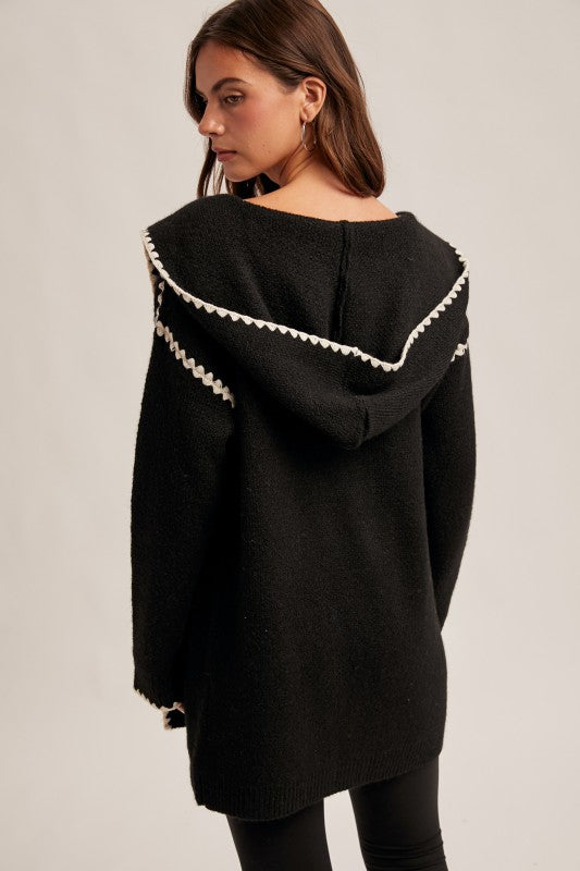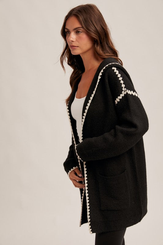 Classic comfort meets playful detail in this cozy hooded cardigan. Designed in a soft black knit with contrasting ivory whipstitch trim, it features an open front, relaxed fit, and front patch pockets for laid-back ease. Perfect for layering over tanks, tees, or casual dresses, this cardigan adds just the right touch of texture and charm to any outfit.