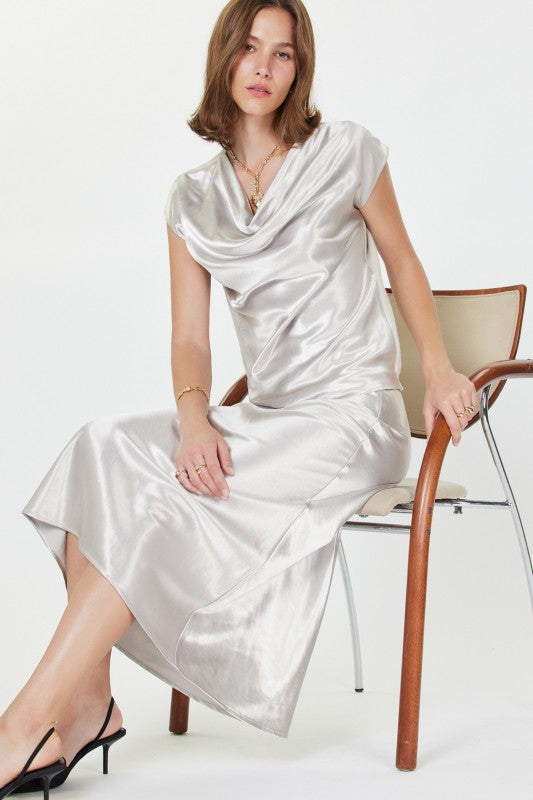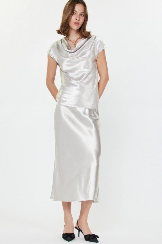 An elegantly draped essential, this satin-like top features a soft cowl neckline and cap sleeves. The lustrous fabric catches the light beautifully, while the relaxed fit skims the body for an effortless, elevated look. Perfect for dressing up or down, it pairs seamlessly with its matching skirt or your favorite separates.
