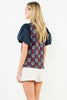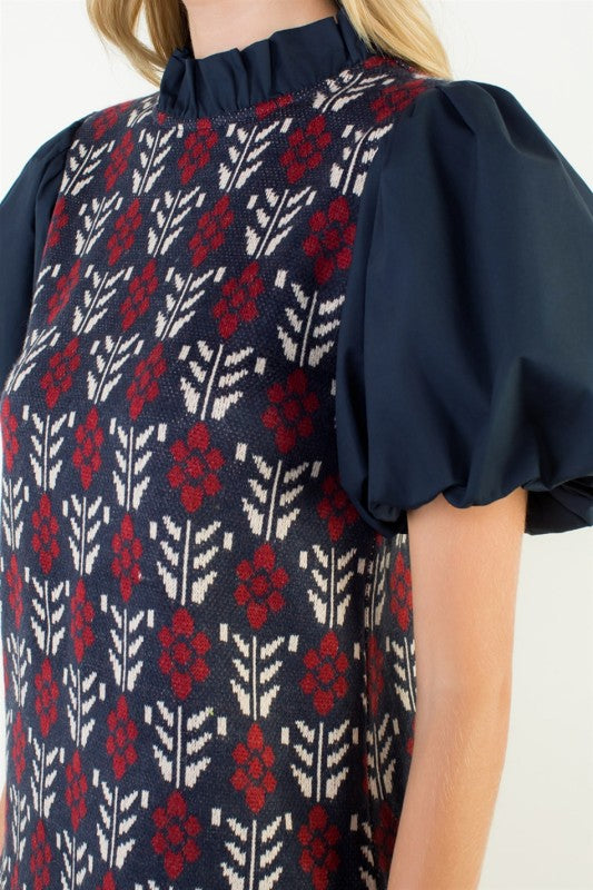 This charming mixed-media top blends vintage-inspired florals with modern structure. The front panel features a navy knit design patterned with red and ivory flowers, while the solid puff sleeves add a dramatic, feminine touch. A mock neckline and gently fitted silhouette create a polished, versatile look—perfect for pairing with denim for day or a sleek skirt for evening.