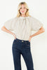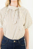 This effortlessly elegant blouse is a timeless staple with a feminine twist. Designed with soft vertical stripes, it features a gathered neckline finished with a delicate self-tie bow for a polished, elevated look. The relaxed short sleeves add subtle volume, creating an easy silhouette that drapes beautifully whether tucked or worn loose. Lightweight and breathable, this top transitions seamlessly from workdays to weekends and pairs perfectly with denim, trousers, or skirts.