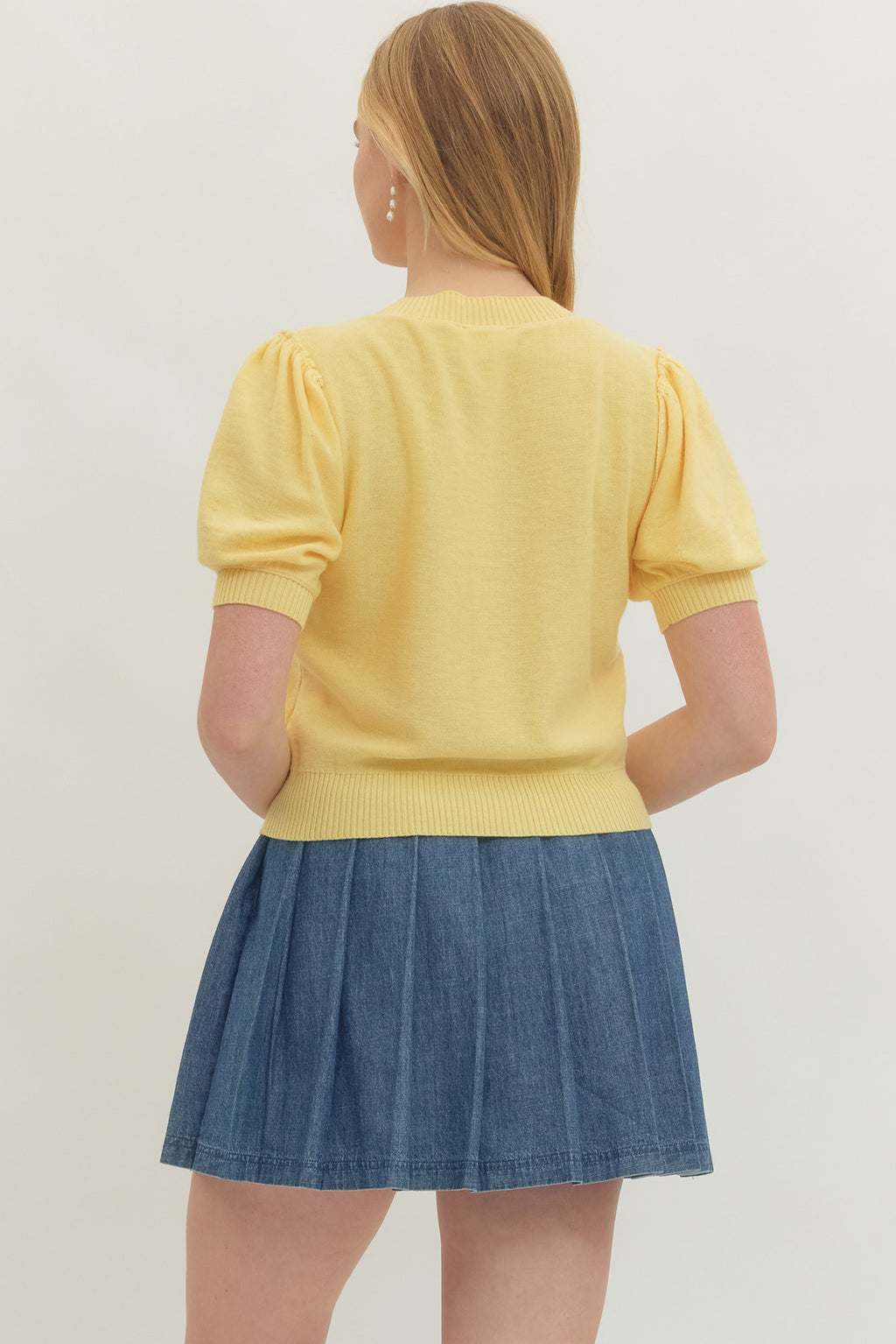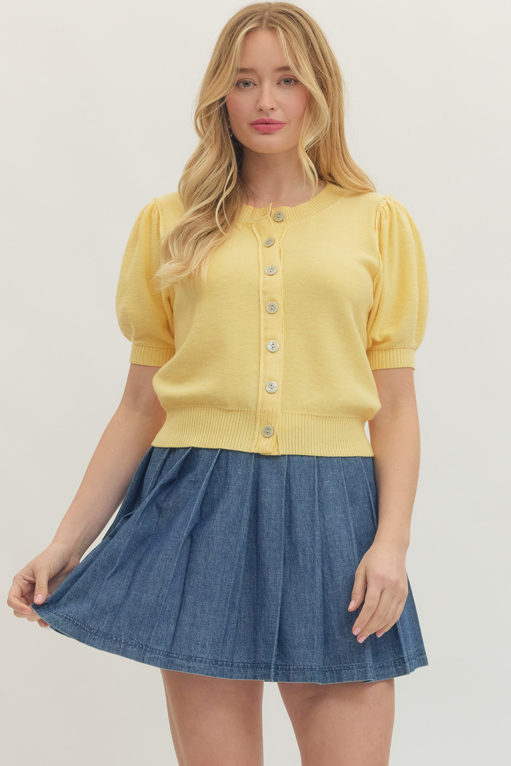 A polished classic with a feminine twist, The Scarlett Puff Sleeve Knit Top is the perfect lightweight layer for spring. Designed in a vibrant solid hue, this soft knit features subtle puff sleeves and a full button-front closure for a timeless, flattering silhouette.