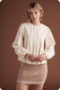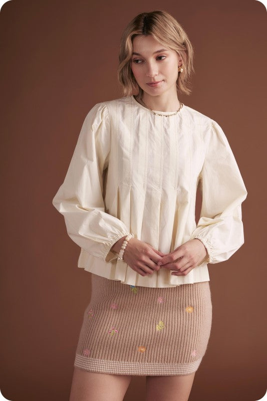 Studio Strut and Bolt Collection. Pintuck long sleeve top in cotton poplin fabric. This versatile blouse features pin-tuck detail throughout front/back bodice, a round neck, long bubble sleeve with elastic cuff, shirred shoulder and keyhole with button closure at back.