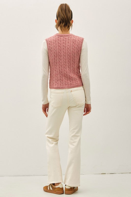 A modern twist on a timeless classic, the Strawberry Shortcake Vest features a rich cable-knit texture and a flattering V-neckline accented with horn buttons. Designed with front pockets and a slightly cropped length, it layers effortlessly over blouses or dresses for a polished yet relaxed look. Soft, structured, and endlessly versatile — this button-down vest adds a touch of heritage charm to any outfit.