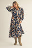 A breezy boho beauty with everyday ease. This long-sleeve midi features a painterly floral print, a collared split neckline with solid contrast trim, and matching contrast cuffs. The tiered, relaxed silhouette includes handy side pockets and falls to a swishy mid-calf length—perfect with boots or sneakers for effortless polish.