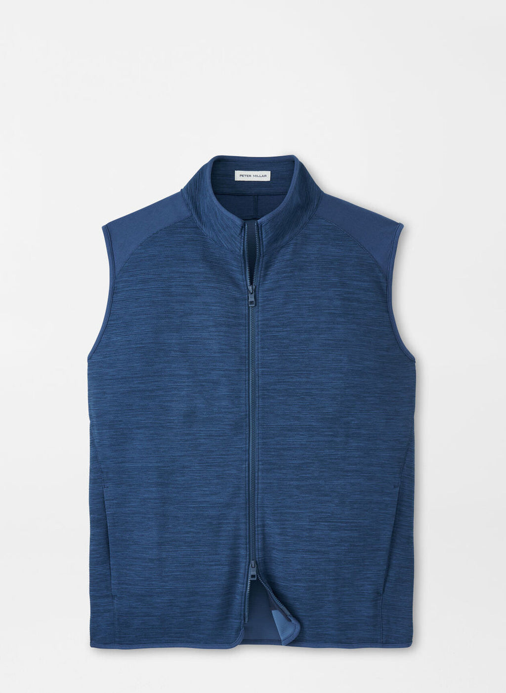 This standout vest is perfect for the course and beyond. The main body is engineered from an ottoman jacquard fabric that offers a textured look and feel around the core. Stretch jersey panels at the shoulders add to its mobility, while a mesh interior allows for breathability and easy on-off layering.