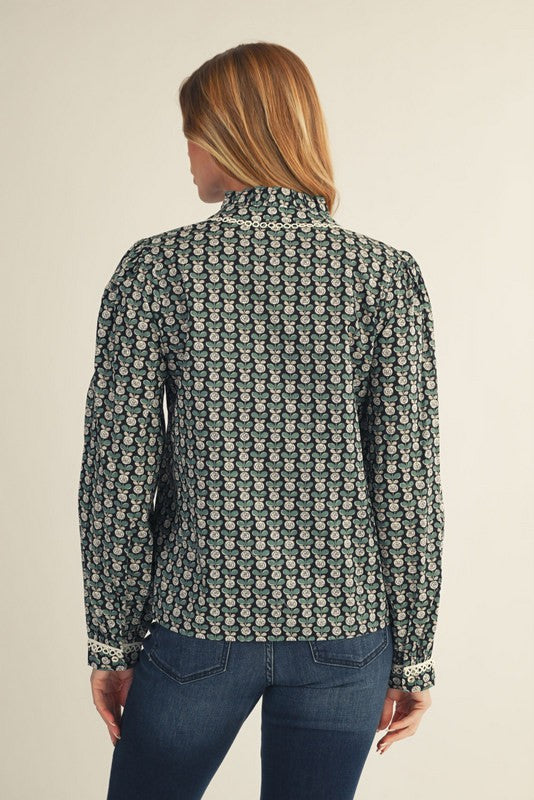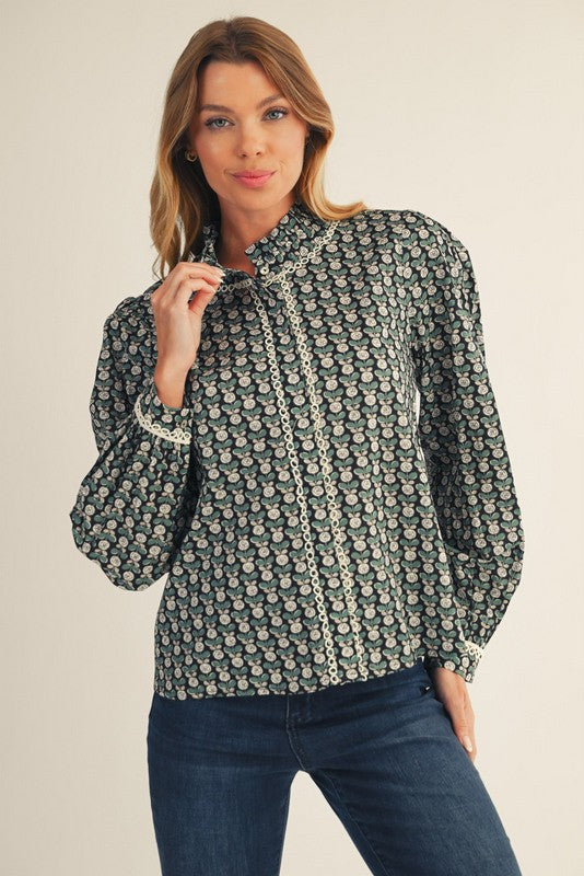 Romantic detail meets everyday ease. This long-sleeve floral button-down features a ruffled neckline with tie detail, delicate lace trim along the placket and cuffs, and softly gathered sleeves for a feminine finish. The relaxed silhouette tucks neatly into denim or trousers and looks just as pretty worn loose.