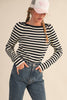Classic Breton vibes with a feminine twist. Our Striped Boat Neck Sweater features a sleek boat neckline, subtle gathered puff shoulders, and a waist-length, fitted bodice that tucks cleanly into high-rise denim. Soft rib knit gives just-right stretch while keeping its shape—polished enough for work, playful enough for weekends.