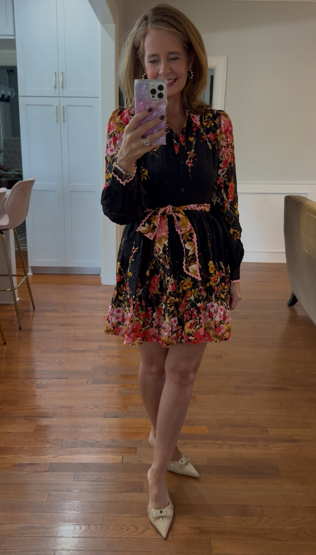 A modern update on the classic shirt dress, this style features a black base accented with a striking floral border print. The button-down front and waist tie create a tailored, flattering shape, while the flow of the fabric keeps it easy and refined. Versatile enough for day or evening, this dress balances structure and softness in all the right ways.