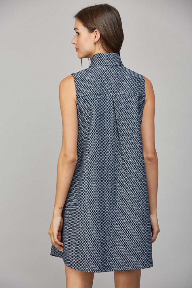 Tailored yet relaxed, this printed shirt dress combines a high stand collar with a swingy silhouette for a look that’s both architectural and wearable. Designed in a navy-and-white geometric motif, it works as easily with sandals by day as it does with heels for evening. And even carry it into the winter months with a layered turtleneck!